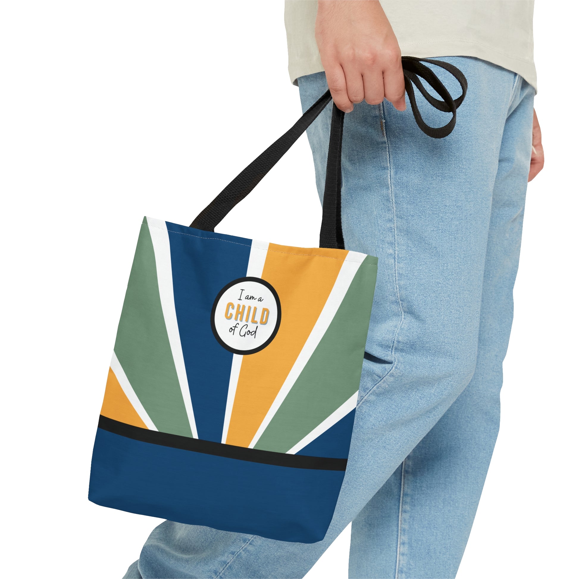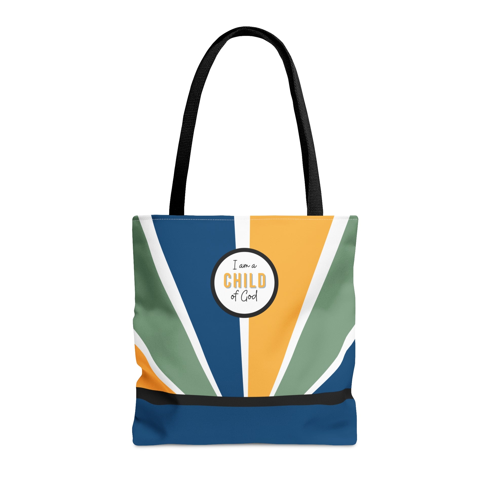 This beautiful sunbeam pattern high-quality Tote Bag is available in three sizes. This makes a great baptism gift or a great tote your kids can carry at church, the beach, or out of town. Made from reliable materials, lasting for seasons. .: 100% Polyester .: Boxed corners .: Black inner stitching, transparent thread on hems. .: Black cotton handles .: With non-woven laminate inside .: NB! Size tolerance 0.75" (1.9 cm)) .: Assembled in the USA from globally sourced parts