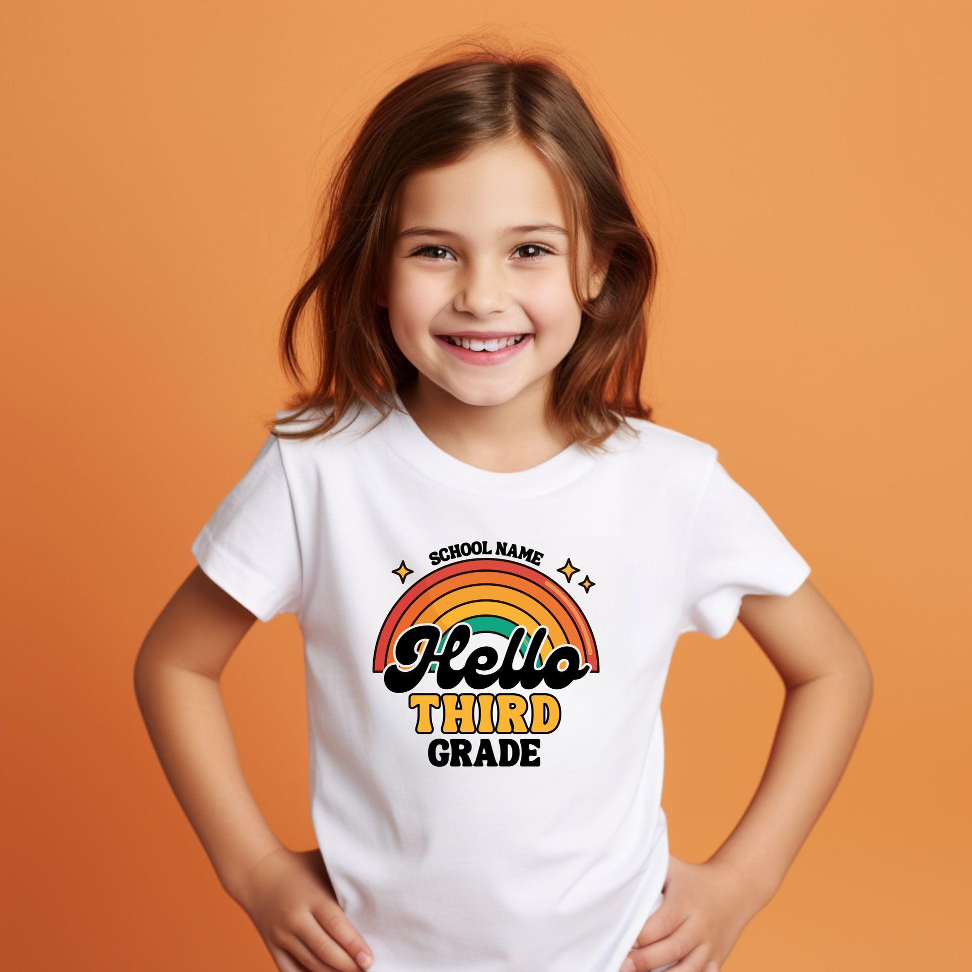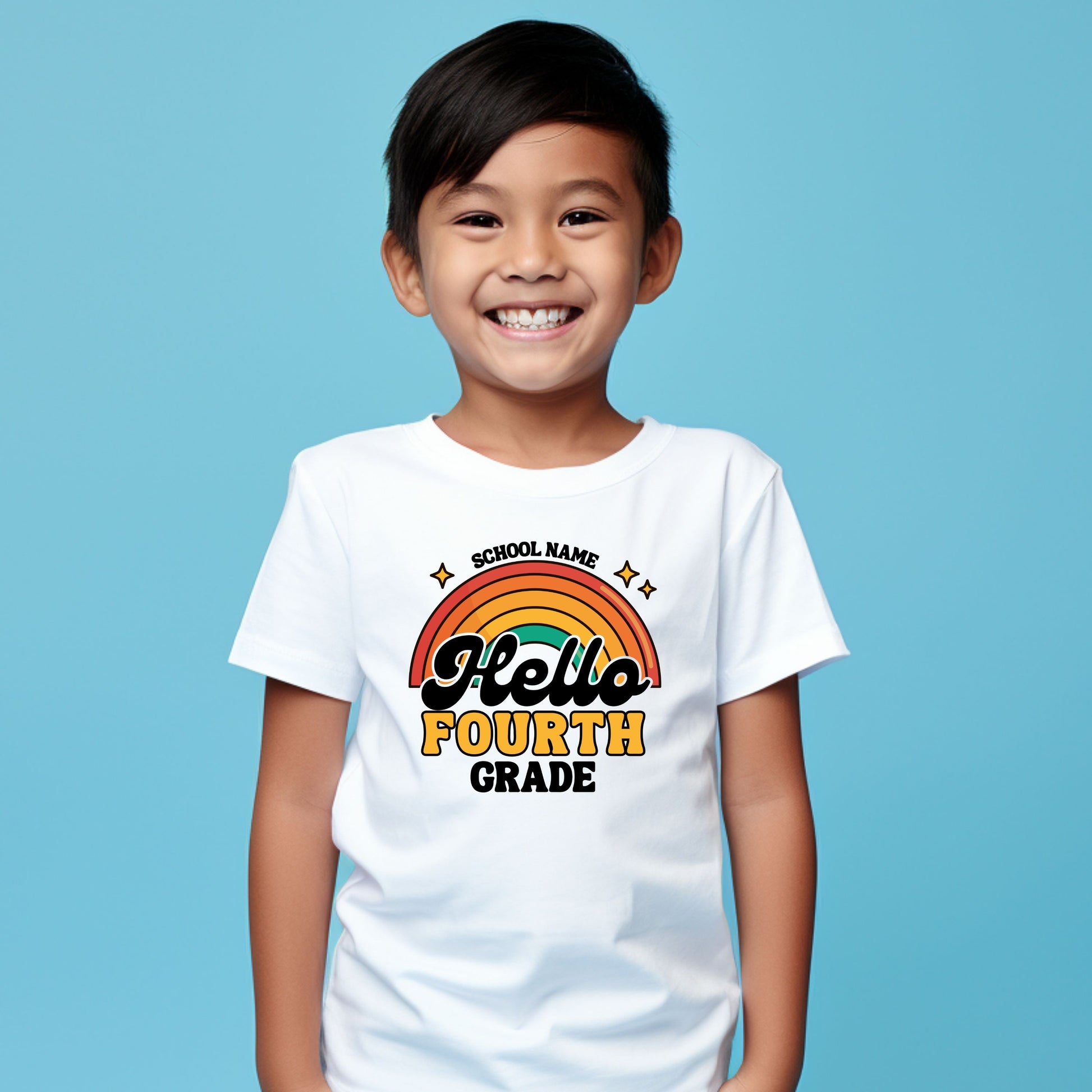 Celebrate your class's Grade in style with this Retro Shiny Rainbow Customizable Grade Short Sleeve Tee! This bright and cheerful shirt features fun, colorful designs that match your energetic school spirit. Made from soft, comfy fabric, it’s perfect for all-day wear—from classroom adventures to after-school fun. Show off your groovy vibes and make every school day a blast!